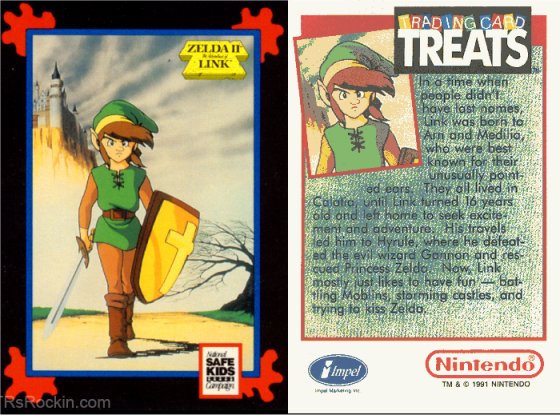 In 1991 a company called Impel made a series of trading cards to be given out as an alternative to traditional Halloween candy and one of the ranges included Nintedo characters. There were two Zelda themed cards in the collection which had pictures on the front with information on the back that seemed to be a cross from the original games and the cartoon. The second one shown below informs us that one of Link's favourite pasttimes is trying to kiss Zelda!