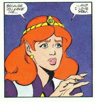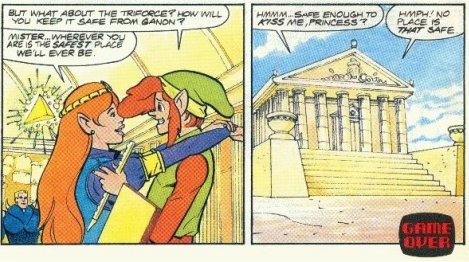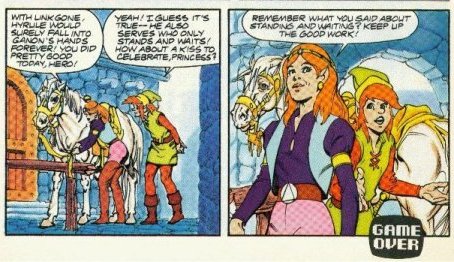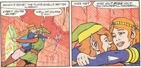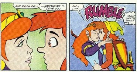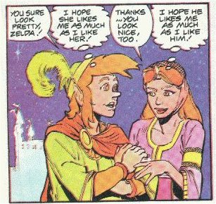 The Valiant comics, like the cartoon, are a total goldmine of wonderful Link/Zelda romantic moments. In most cases it's a lot like the cartoon with Link trying to get kisses from Zelda, however there are some more serious moments (in fact some of the stories are better than the cartoon episodes), in particular the part where Zelda admits she really does love Link. The writers even included a cute two page story for a Valentines special where our favourite due even go on a real date.