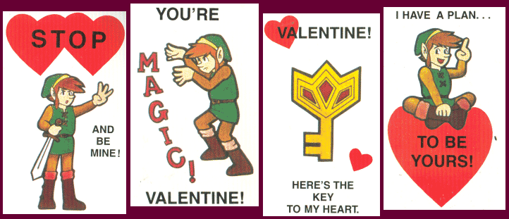 Back in 1989 a company called Paper Magic used to produced 'themed' booklets of Valentines cards using all different characters from Super Mario Bros to the Teenage Mutant Hero Turtles. They did a Zelda pack using images from the first two games and the pack contained 36 cheesy cards. Check out a few of the designs below;