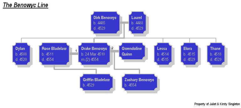 A very important family in Hyrulian standing, the Benowycs started out as a simple mining family in Ruto. Drake, the only survivor, passed up through the ranks to become Head Knight and one of King Harkinian's most trusted council advisors. He was estranged from first love, Rose, who bore him a son he never knew he had for many years, and he married Gwen who had his son Zachary.